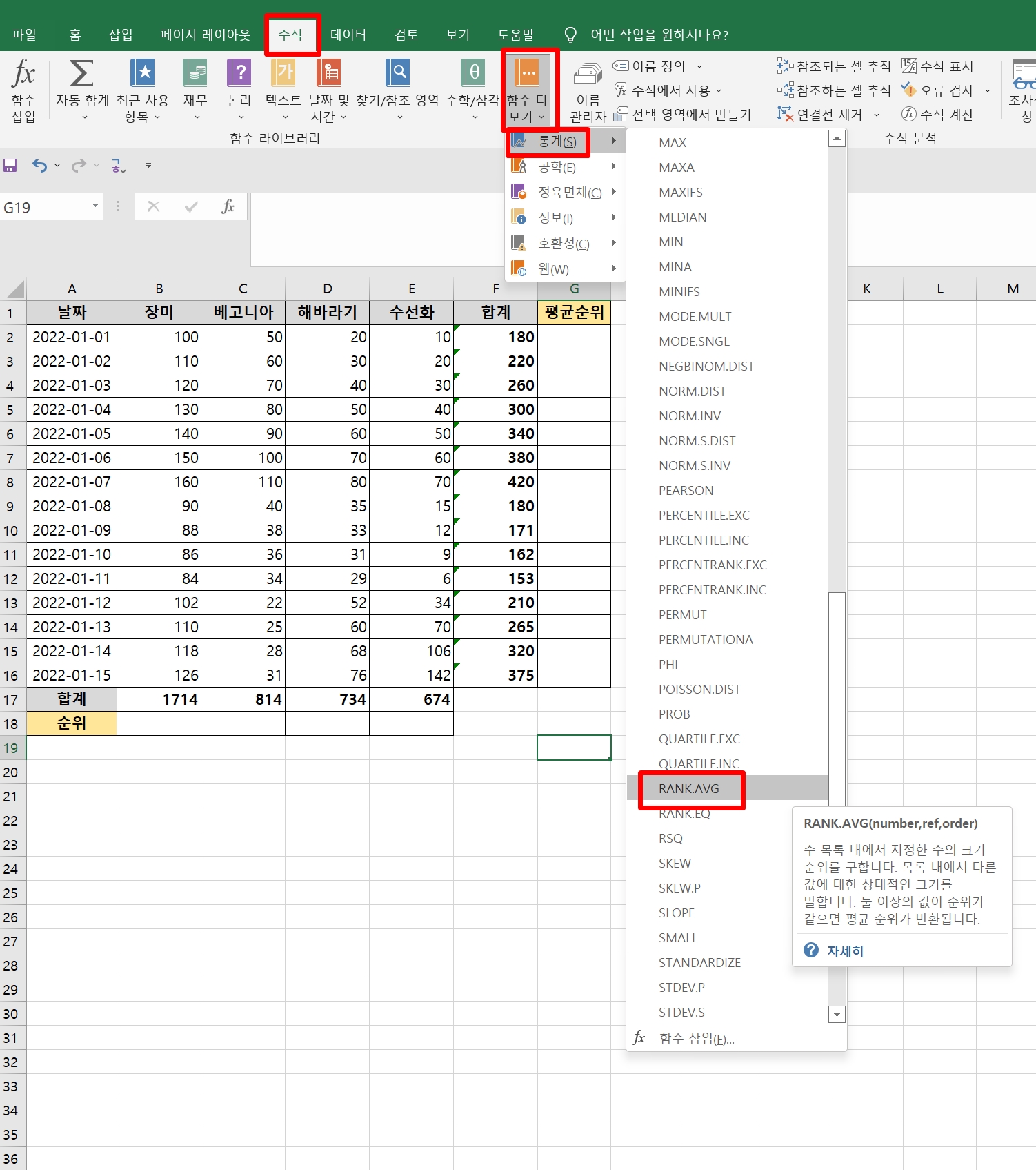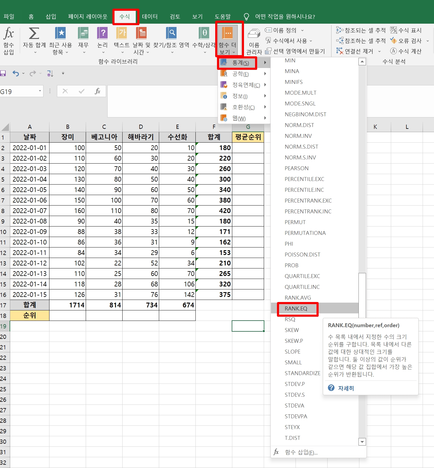2.[수식] -> [함수 라이브러리] -> [함수 더 보기] -> [통계] -> [RANK.EQ] 클릭한다.