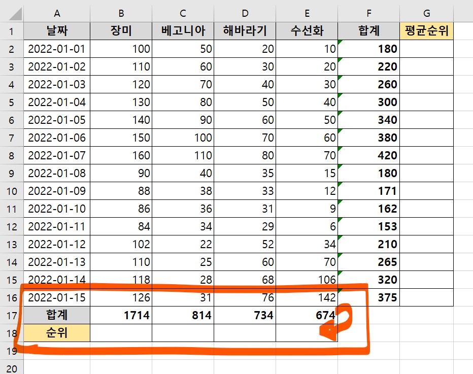 일단, RANK.EQ 함수는 꽃 종류별로 더해놓은 합계를 사용해 가장 많이 팔린것과 가장 적게 팔린 것의 순위를 알아보도록 하겠다.
