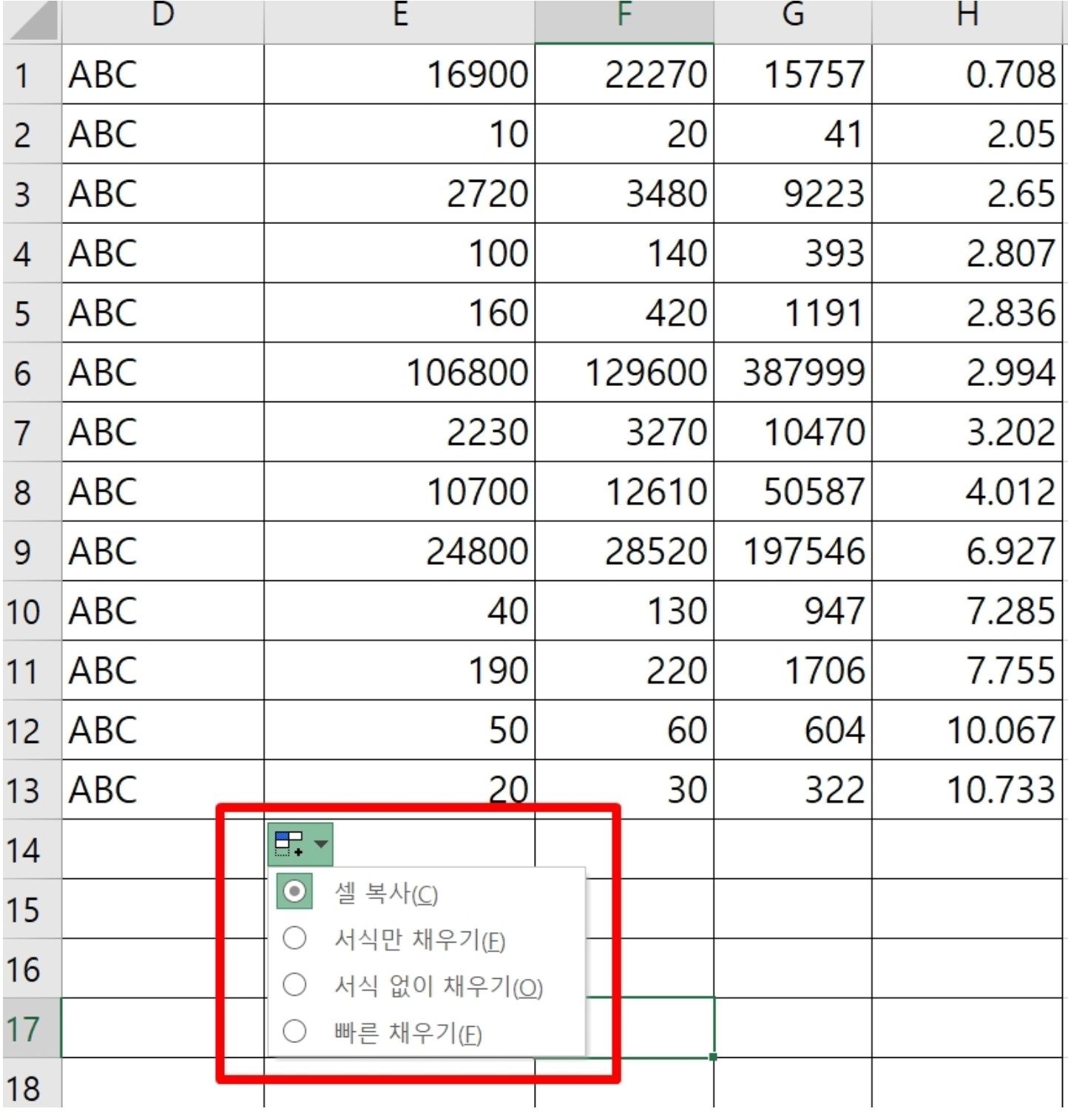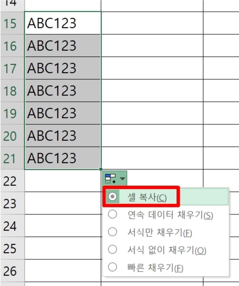 숫자 그대로 복사하는 방법2. 자동채우기 옵션에서 셀복사 이용