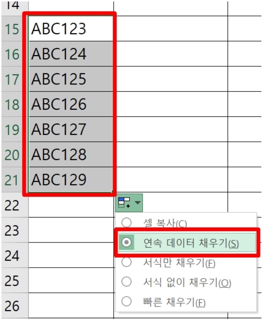 엑셀 숫자 문자 자동 채우기 핸들 옵션