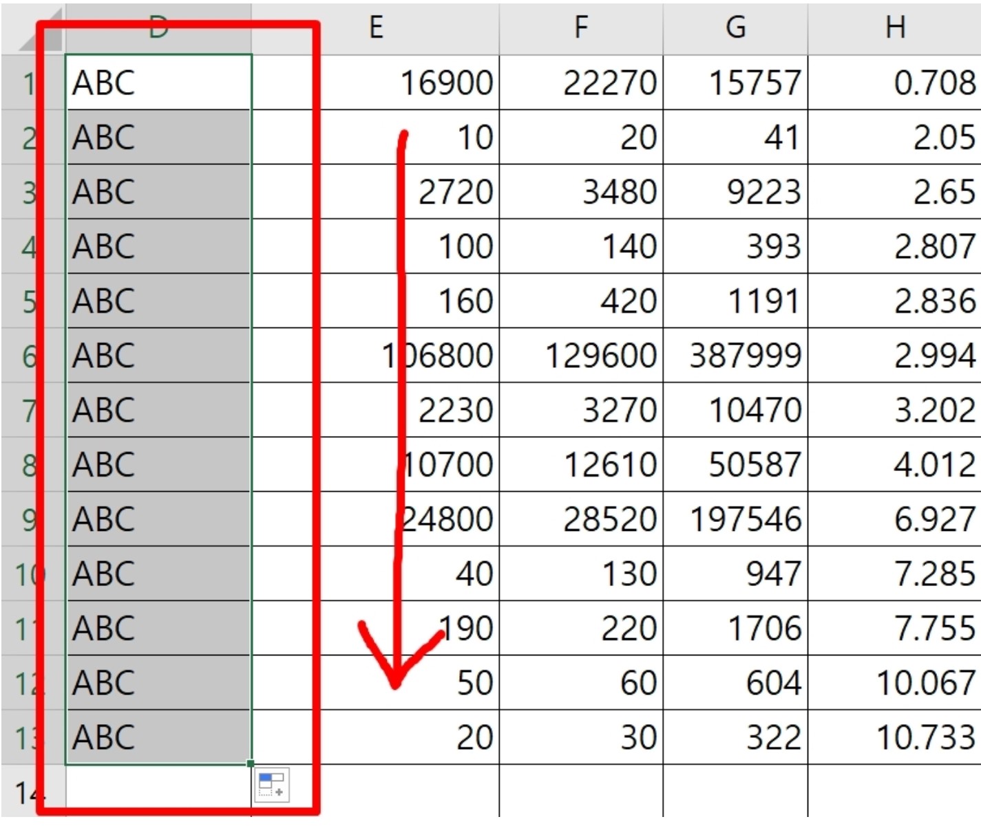 5. 드래그하니, 동일하게 ABC가 D13셀까지 채워졌다.