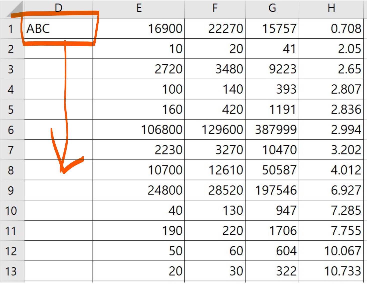 2. 이 ABC를 [D13]까지 채워넣으려고 한다. [D1셀]을 먼저 클릭한다.