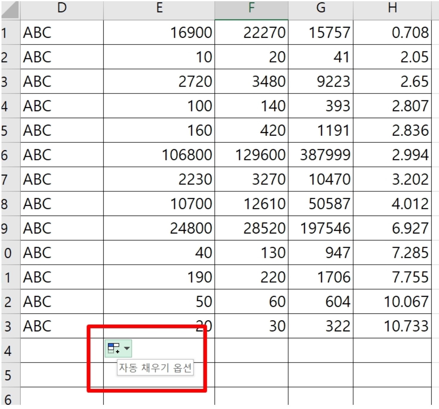 채우기를 마치면, 마지막 셀의 오른쪽 아래에 [자동 채우기 옵션] 아이콘이 뜬다.