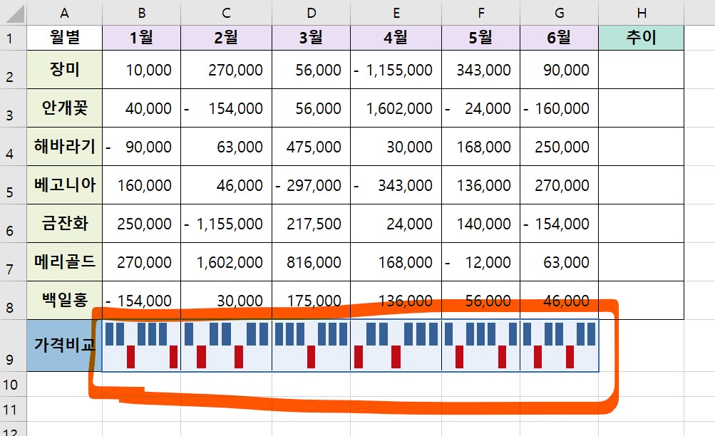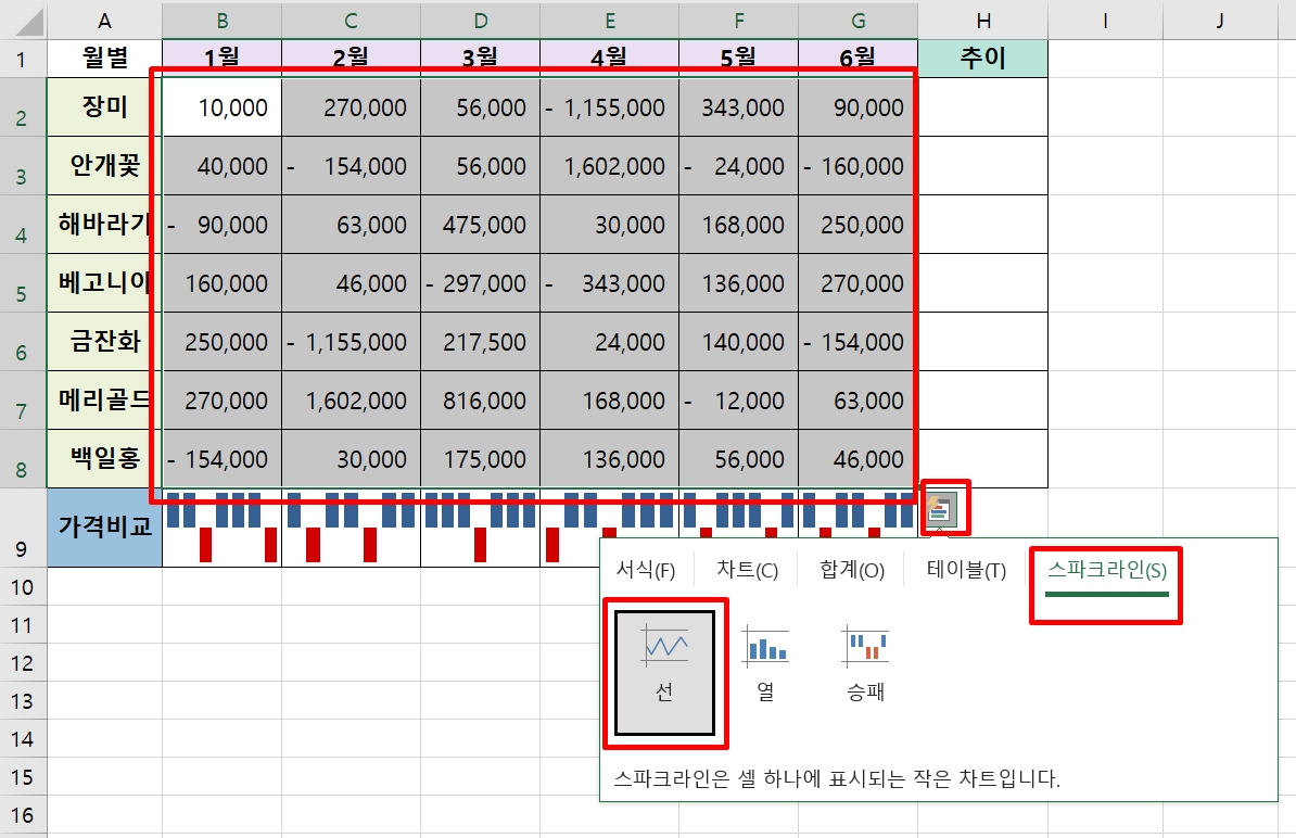 이번에는 추이의 빈칸에 선 스파크라인 차트를 입력해보려고 한다.