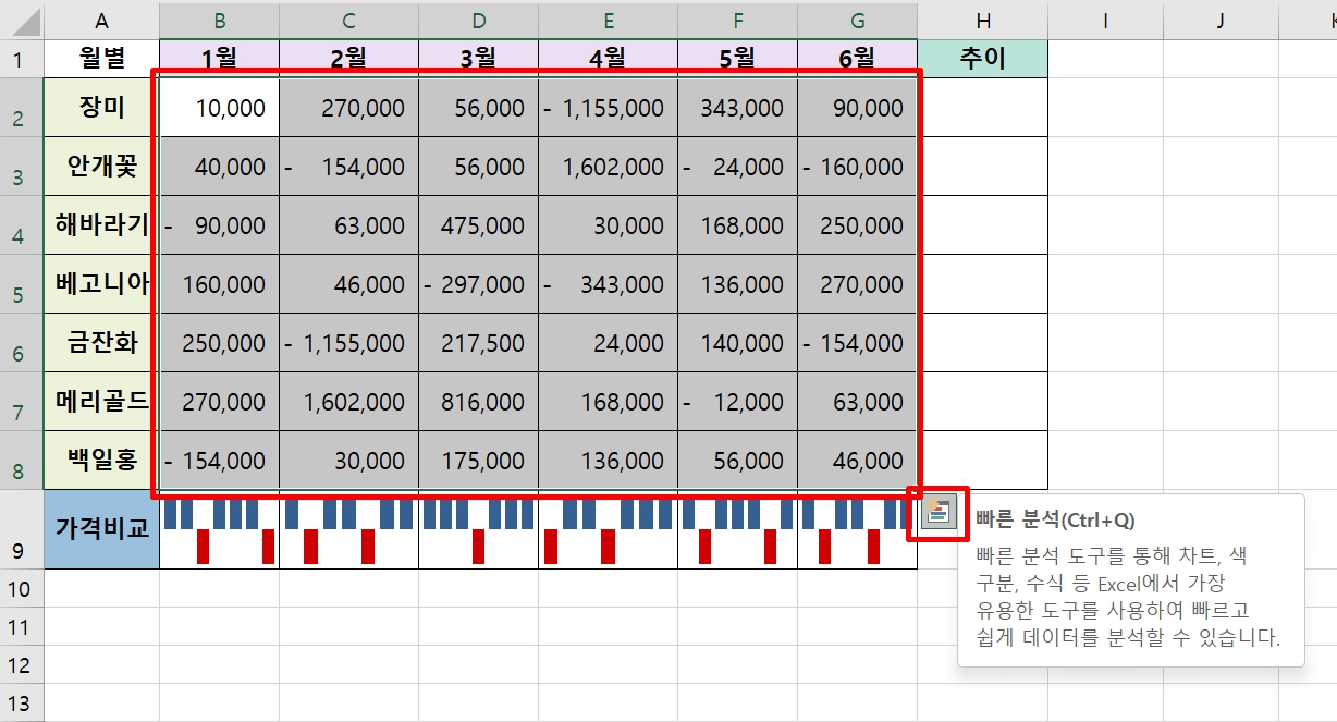 [빠른 분석]을 사용하면, 지정한 범위의 오른쪽 옆에 스파크라인을 삽입한다.