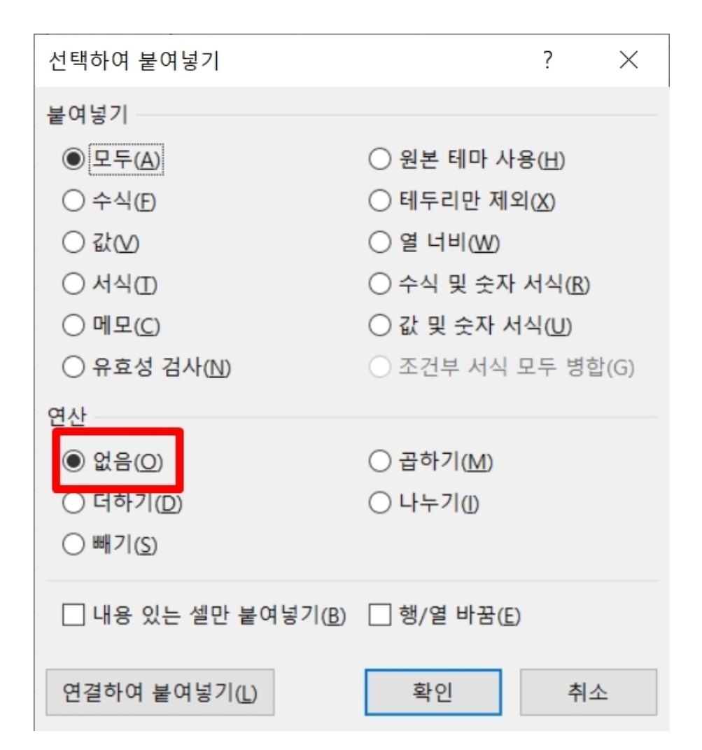 선택하여 붙여넣기 창에서 연산 옵션을 보면, 기본적으로는 '없음'에 선택이 되어 있어 사칙연산 반영이 안된다.