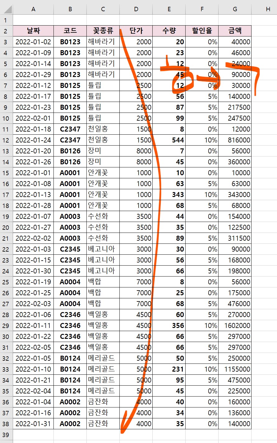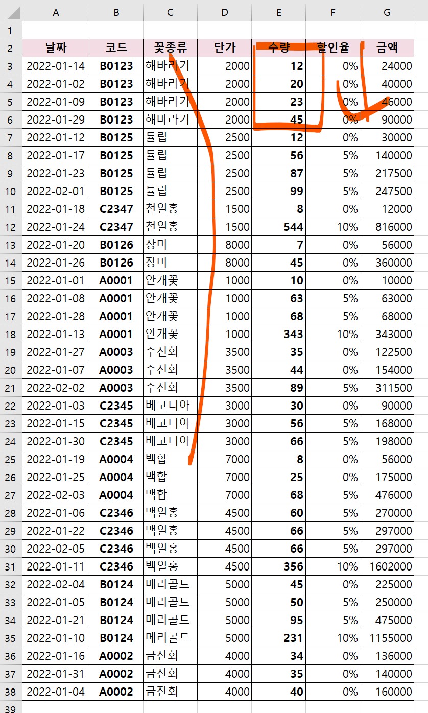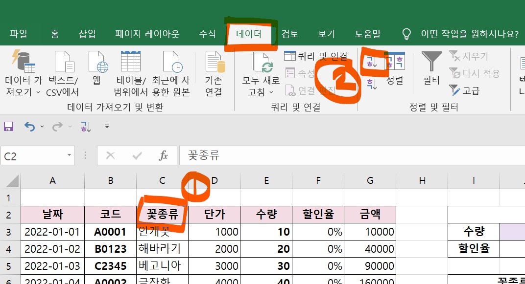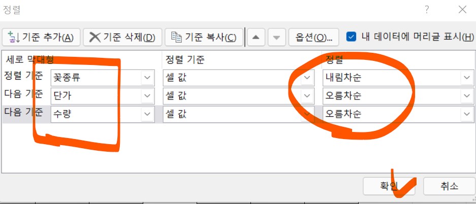 그럼, 꽃 종류만 정렬을 적용하지 말고, 단가와 수량도 같이 정렬을 적용해보려고 한다.
