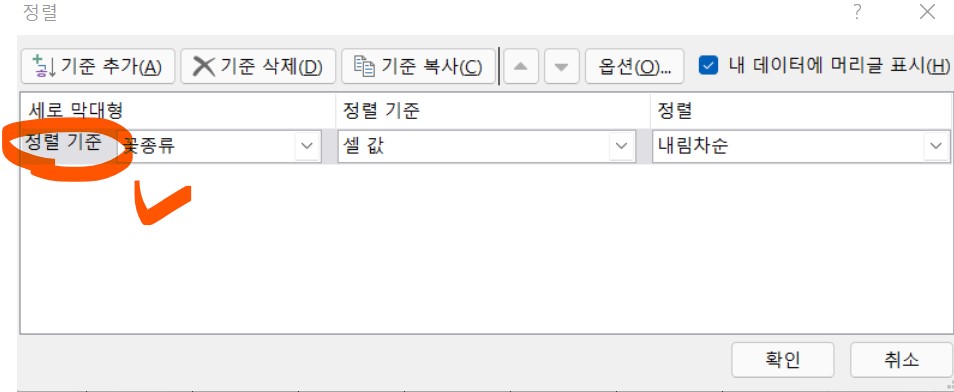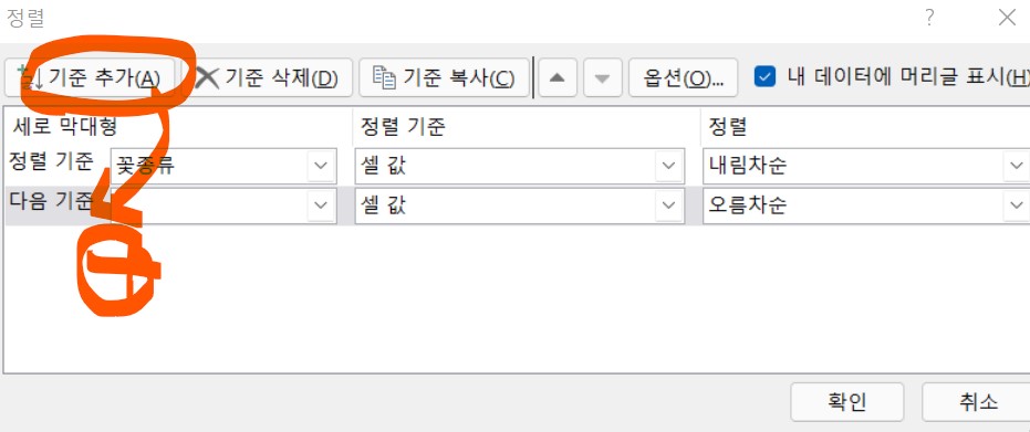 4. [기준추가] 버튼을 클릭해준다. 그럼 정렬기준이 하나 더 추가된다.
