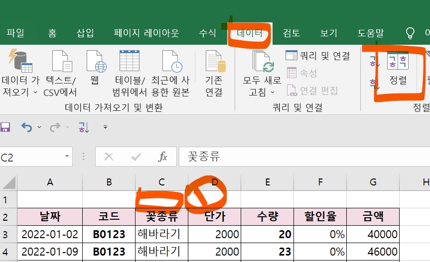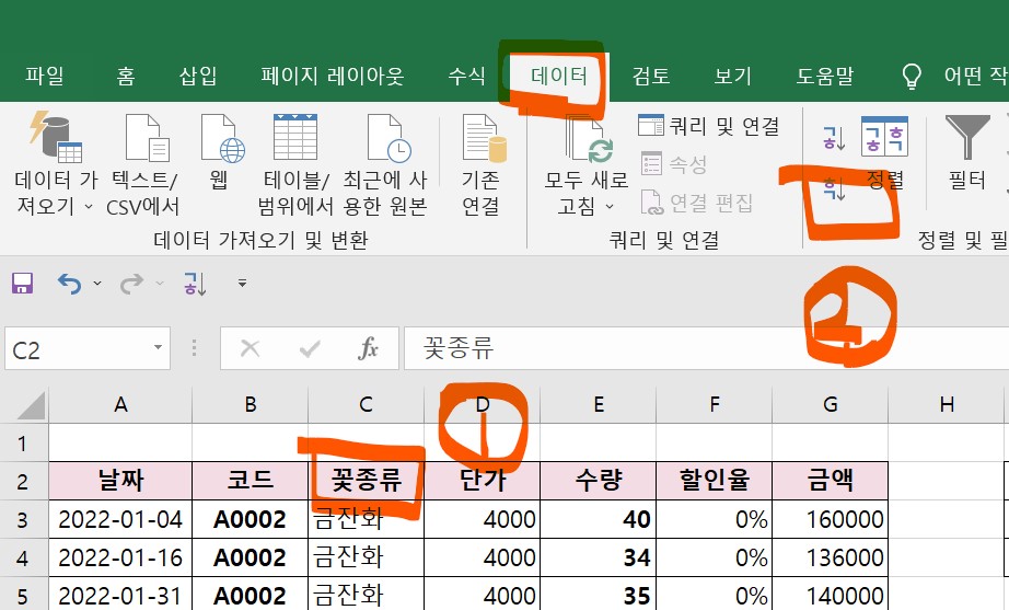 그럼, 꽃 종류만 정렬을 적용하지 말고, 단가와 수량도 같이 정렬을 적용해보려고 한다.