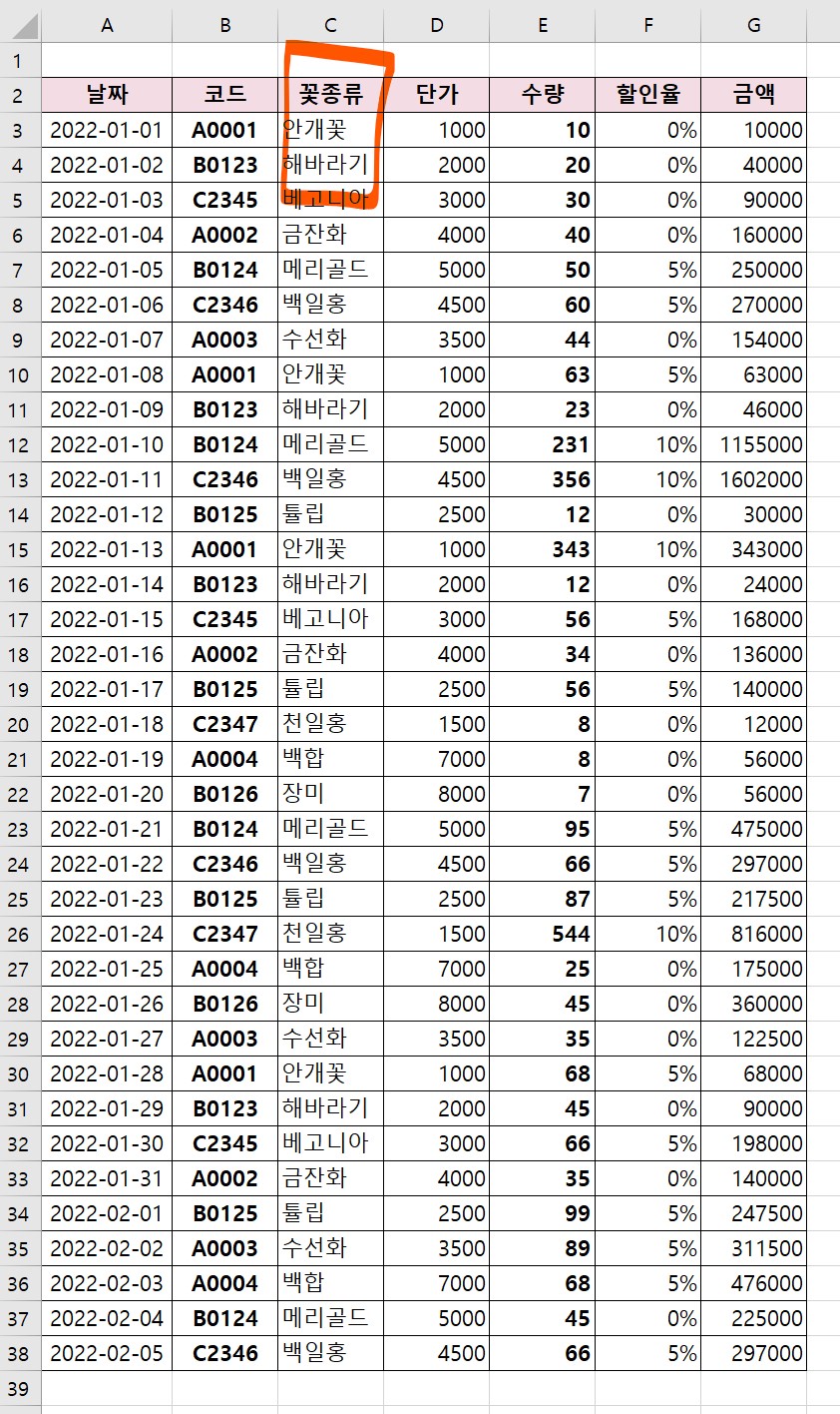 1. 꽃종류 첫 셀을 클릭한다.