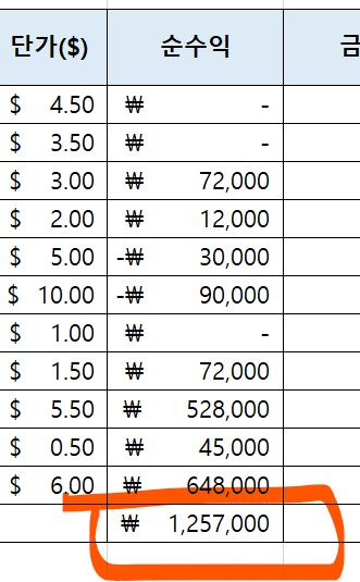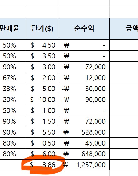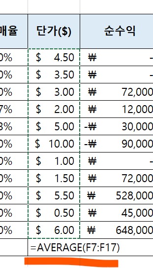 2. 단가의 평균을 구하기 위해, 평균을 구할 셀을 클릭한다.