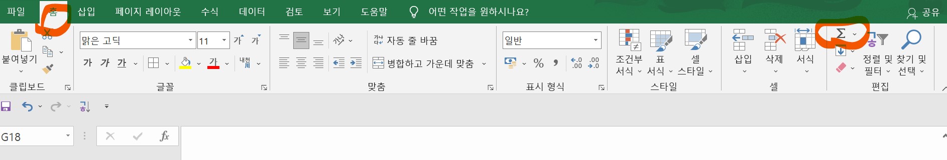 2. [홈] -> [자동합계 아이콘 ∑ ] 을 클릭한다.