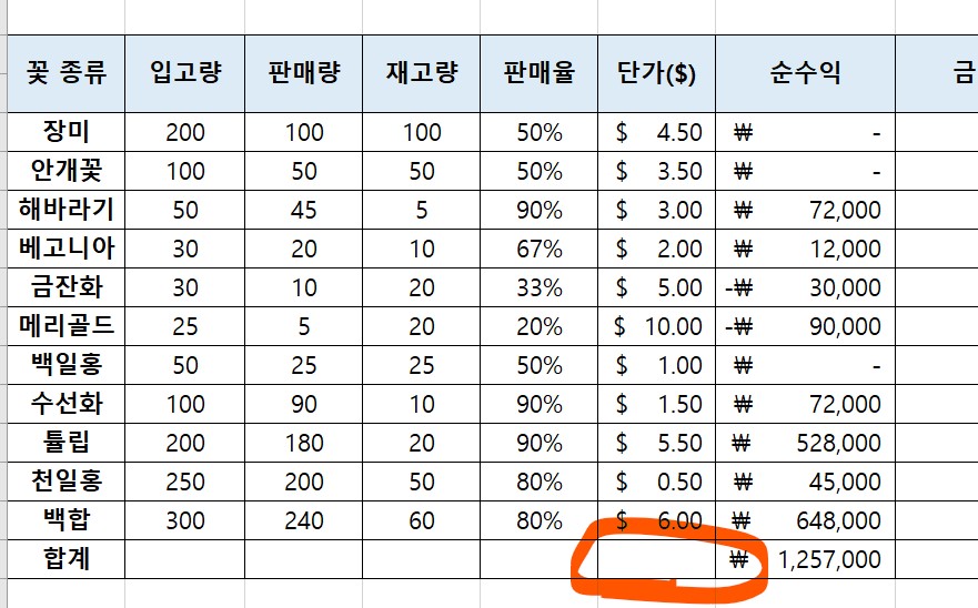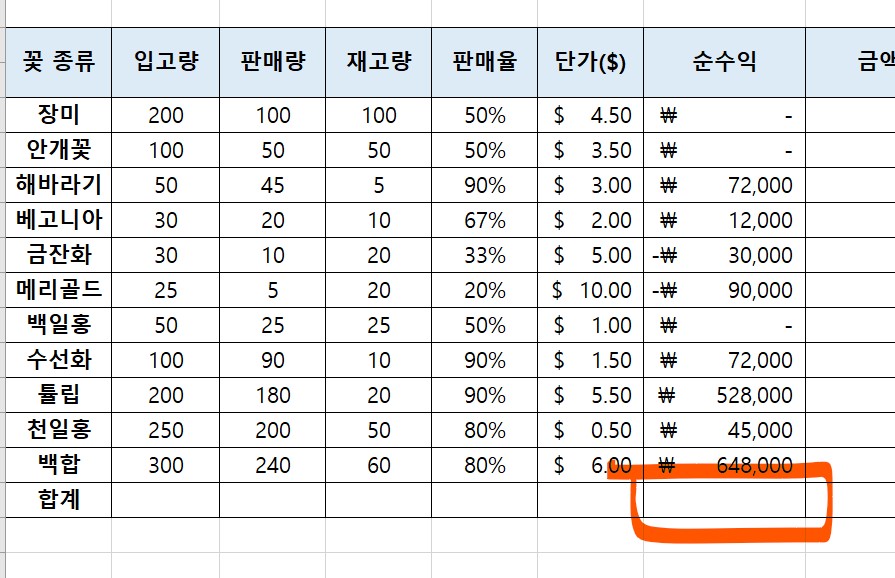 자동합계는 아이콘 클릭 한번만으로 합계가 구해져 정말 유용하다.