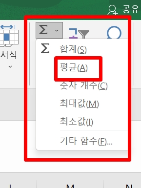 3. [홈] -> [자동합계 아이콘 ∑ ] -> [평균] 을 클릭한다.
