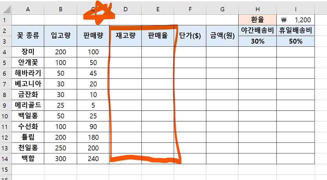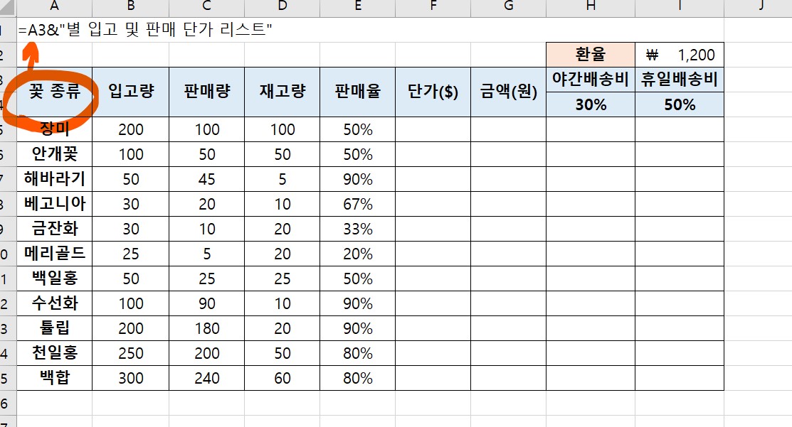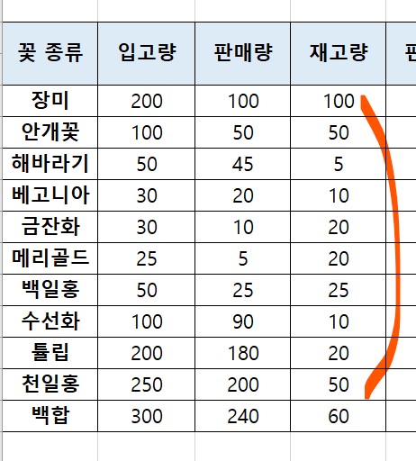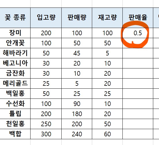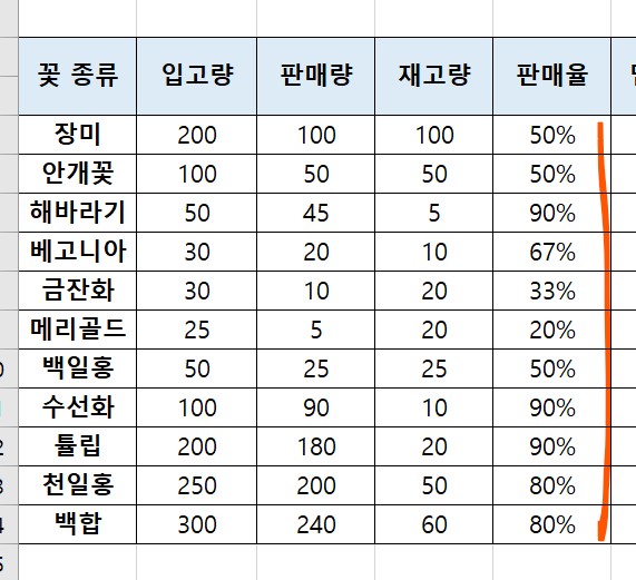 꽃종류에 따른 입고량과 판매량을 바탕으로, 재고량과 판매율을 구해보겠다.