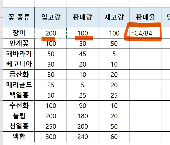 1. 판매율을 구하기 위해, 판매율을 구할 셀을 클릭하고 =판매량(셀클릭)/입고량(셀클릭) 을 입력한다.