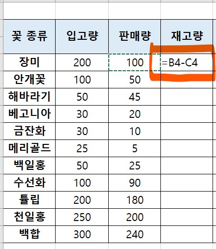 1. 재고량을 구하기 위해, 재고량을 구할 셀을 클릭하고 =입고량(셀클릭)-판매량(셀클릭) 을 입력한다.