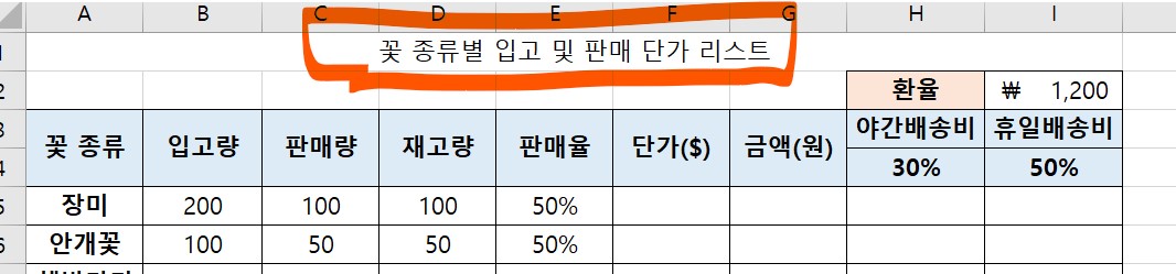 문자가 있는 셀과 문자를 직접 입력하여 제목을 만들어보겠다.