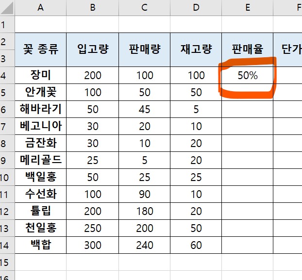 꽃종류에 따른 입고량과 판매량을 바탕으로, 재고량과 판매율을 구해보겠다.