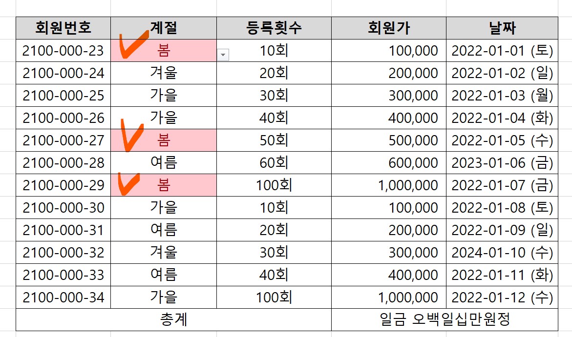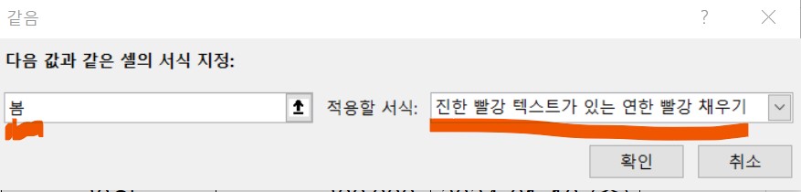 여기에서는 '봄'이라고 입력하여, 봄과 같은 값일때만 연한 빨강 채우기로 표시되도록 하였다.