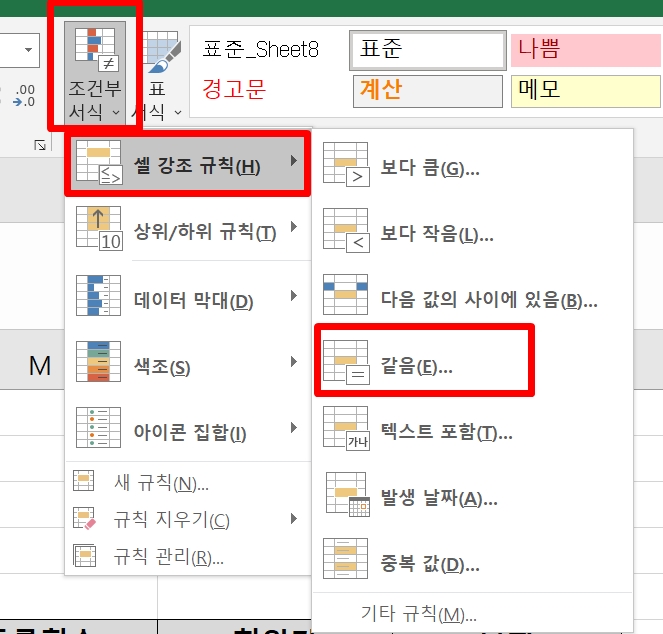 2. [홈]탭에서 [조건부서식]을 클릭하고 [셀강조규칙] -> [같음]을 선택한다.