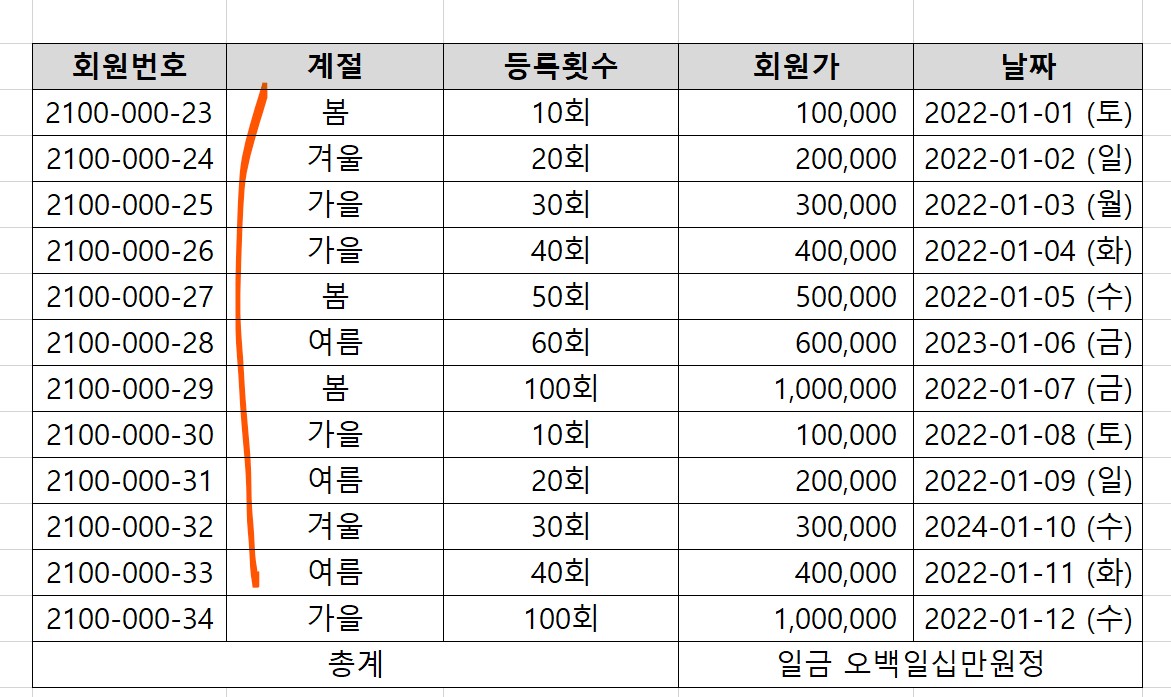 1. 계절 아래의 셀을 블락지정한다.