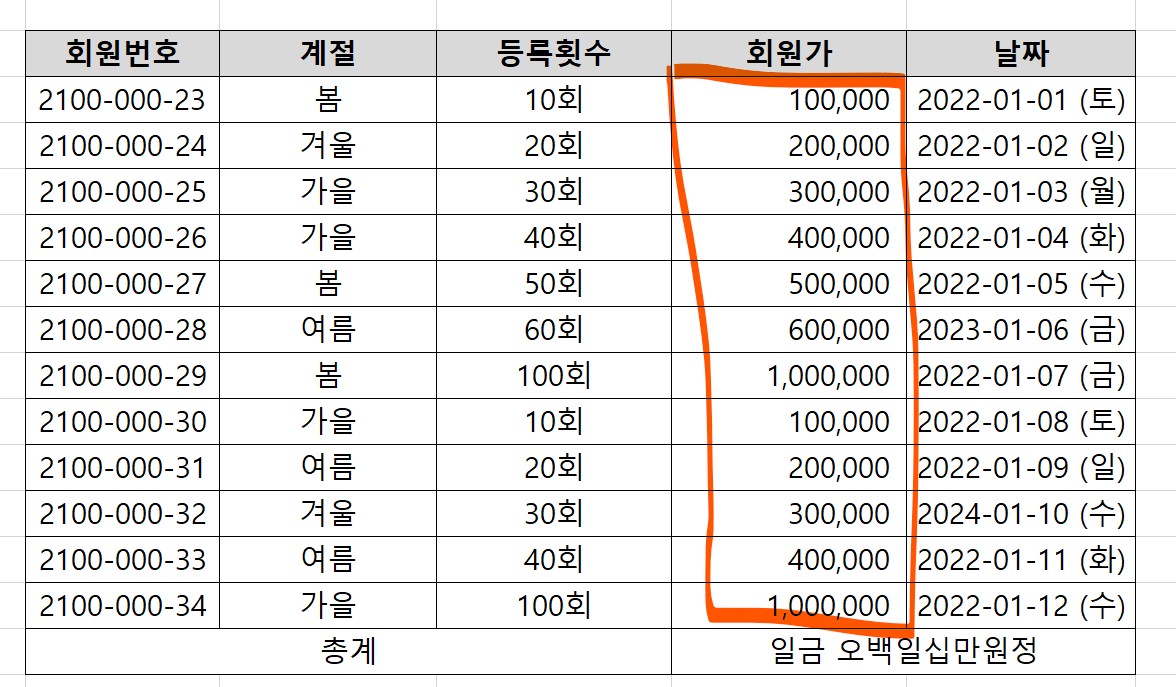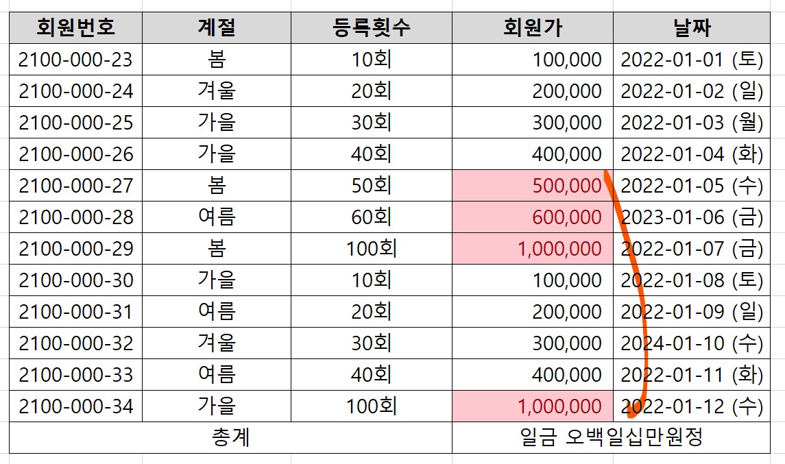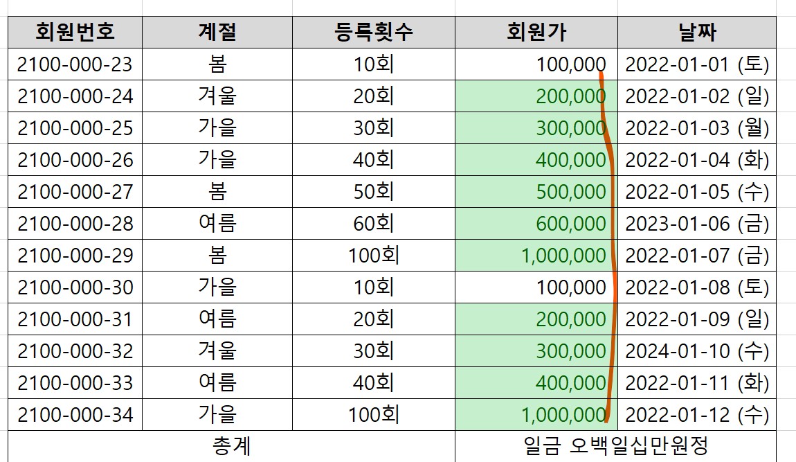 회원가 중, 상위 10개 항목을 초록색셀로 표시했다.