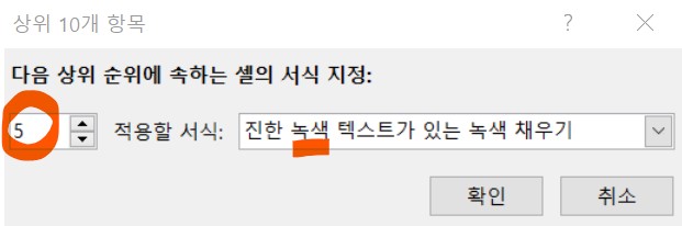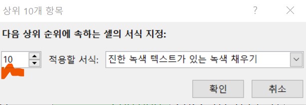 상위 10개 항목을 녹색셀로 표시하라는 뜻.