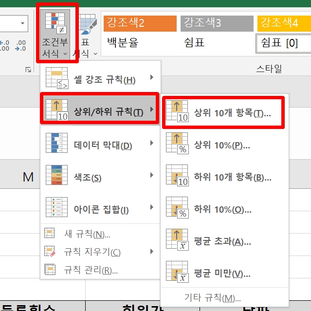 2. [조건부서식] -> [상위/하위 규칙] -> [상위 10개 항목] 을 클릭한다.