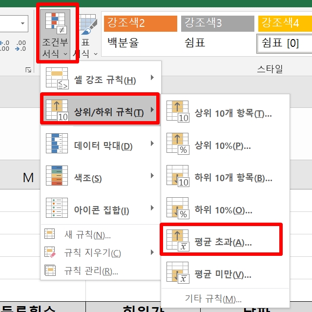 2. [조건부서식] -> [상위/하위 규칙] -> [평균초과] 를 클릭한다.