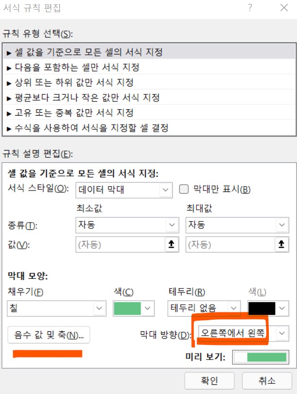 5. [서식 규칙 편집] 아래부분에서 [막대방향]을 선택해준다.