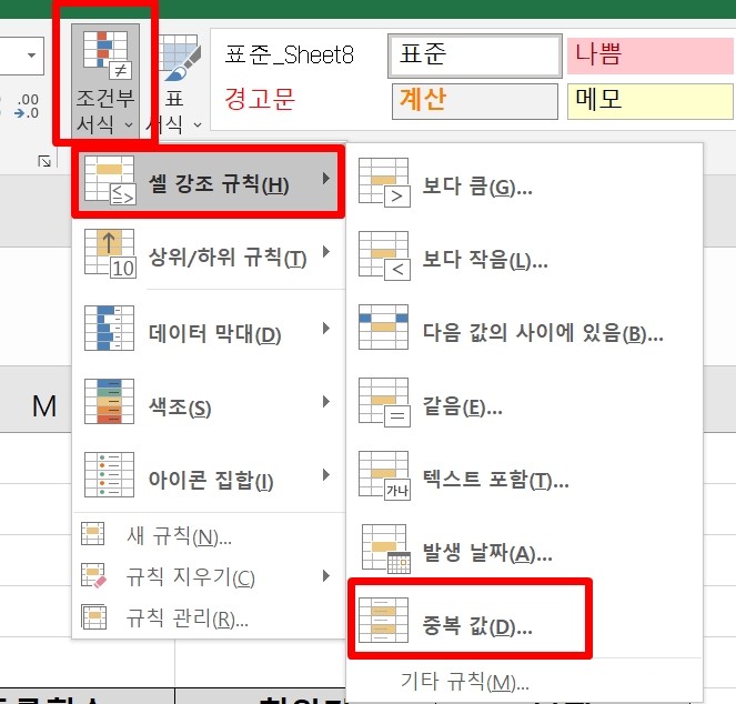 앞선 포스팅에 이어서 셀강조 규칙 중, 중복값과 텍스트포함에 대해 알아보고자 한다.