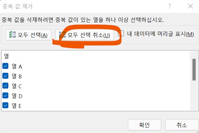 4. [모두 선택 취소]를 누르니, 열의 선택버튼이 모두 사라졌다.