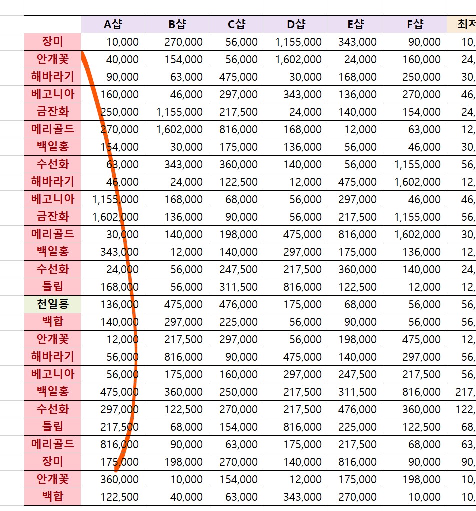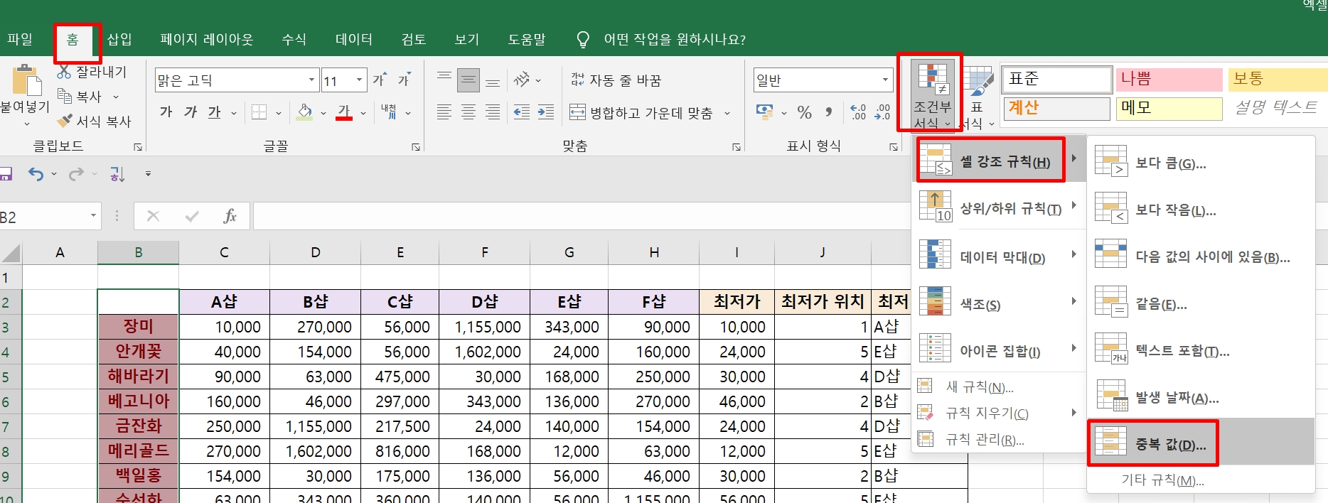 꽃 종류별로 중복된 내용을 빨간색으로 표시해보려고 한다.