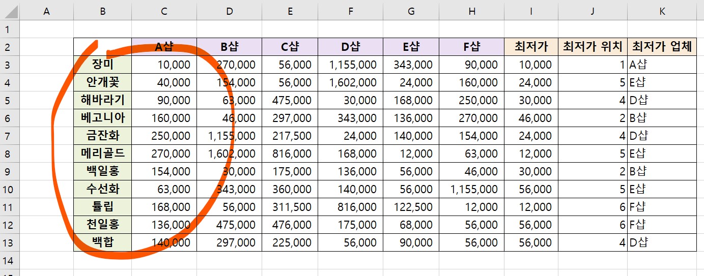 꽃 종류별로 중복된 내용을 빨간색으로 표시해보려고 한다.