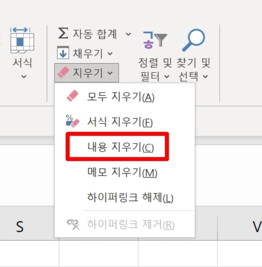 2. [홈] -> [편집] -> [지우기] -> [내용 지우기]를 클릭한다.
