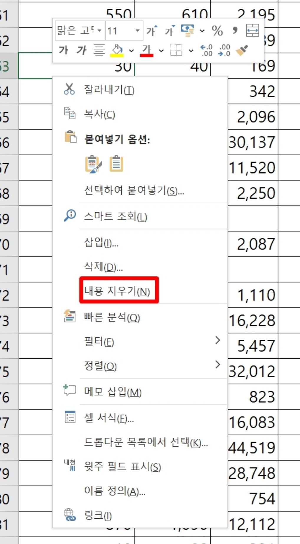 2. 마우스 오른쪽 버튼을 클릭 -> [내용지우기]를 클릭한다.