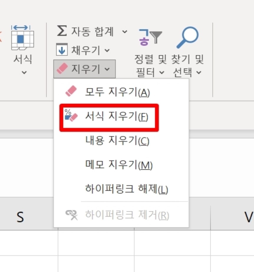 2. [홈] -> [편집] -> [지우기] -> [서식 지우기]를 클릭한다.