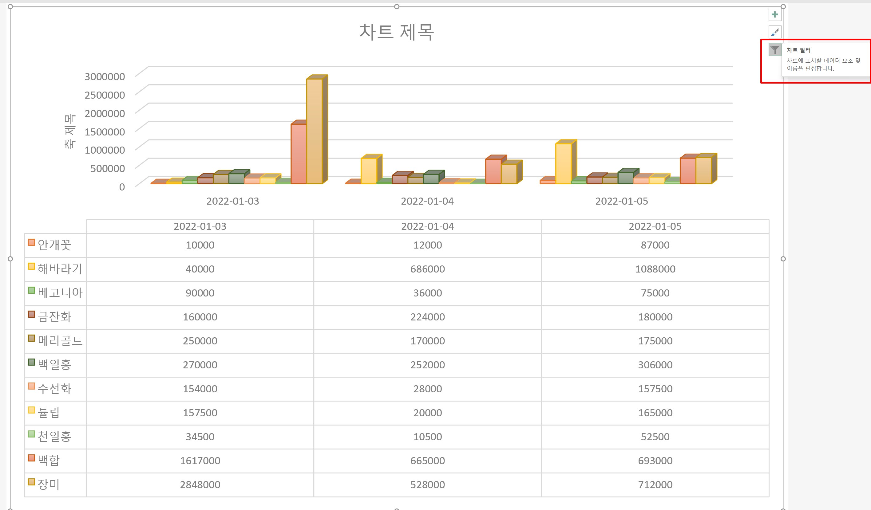 엑셀 차트 필터 기능은 전체 자료 중, 일부 자료만 볼 수도 있고