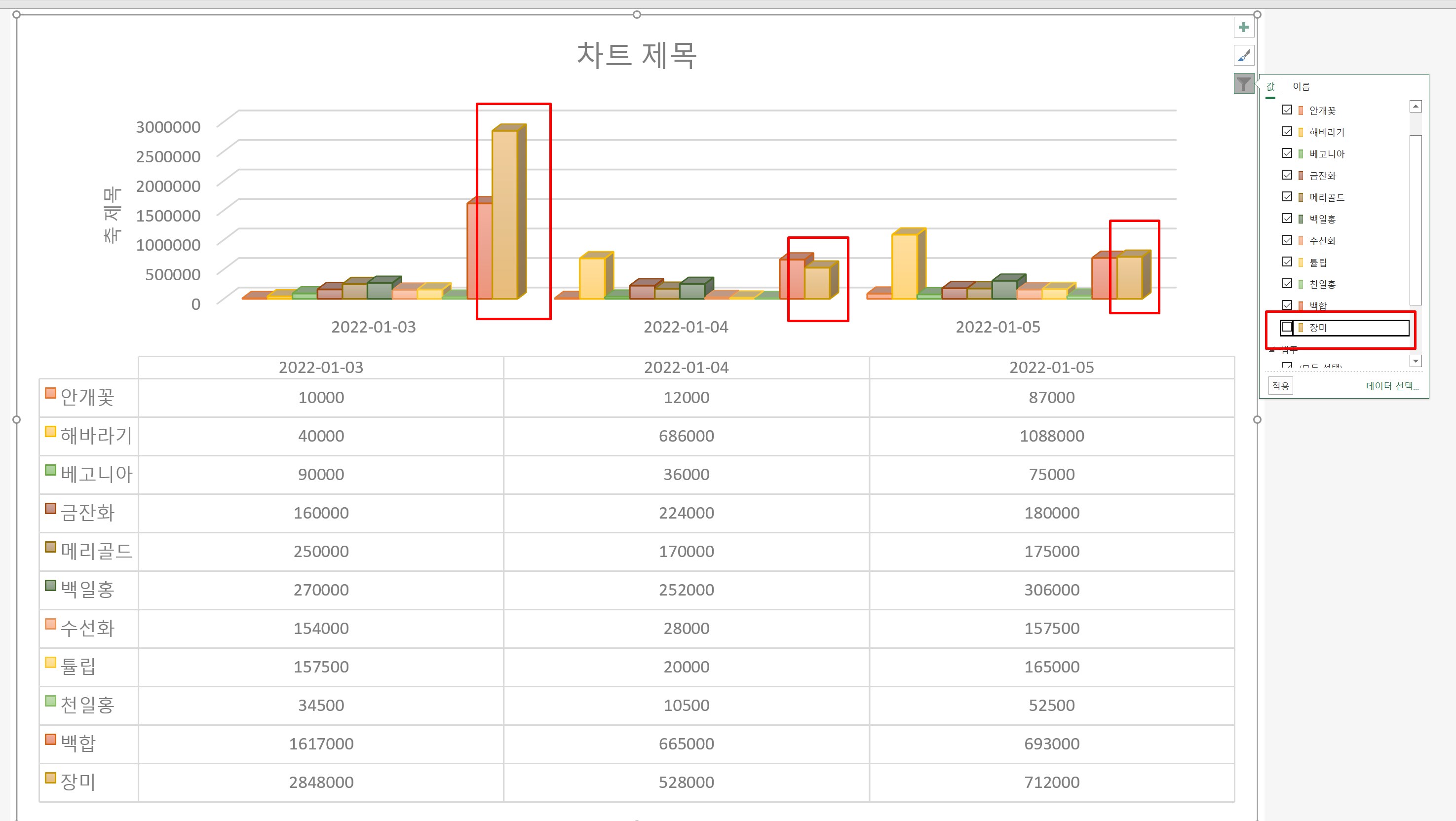 여기에서는 맨 마지막 데이터인 장미를 체크해제 해보겠다.
