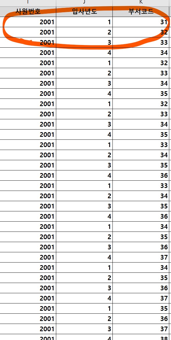 6. 기존에 입력된 사원번호셀부터 데이터가 시작될 예정이므로,