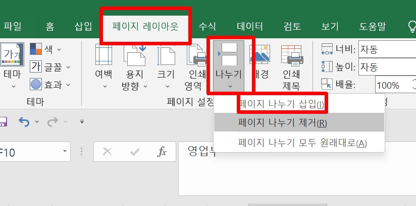 페이지 나누기 삽입, 제거, 모두 원래대로