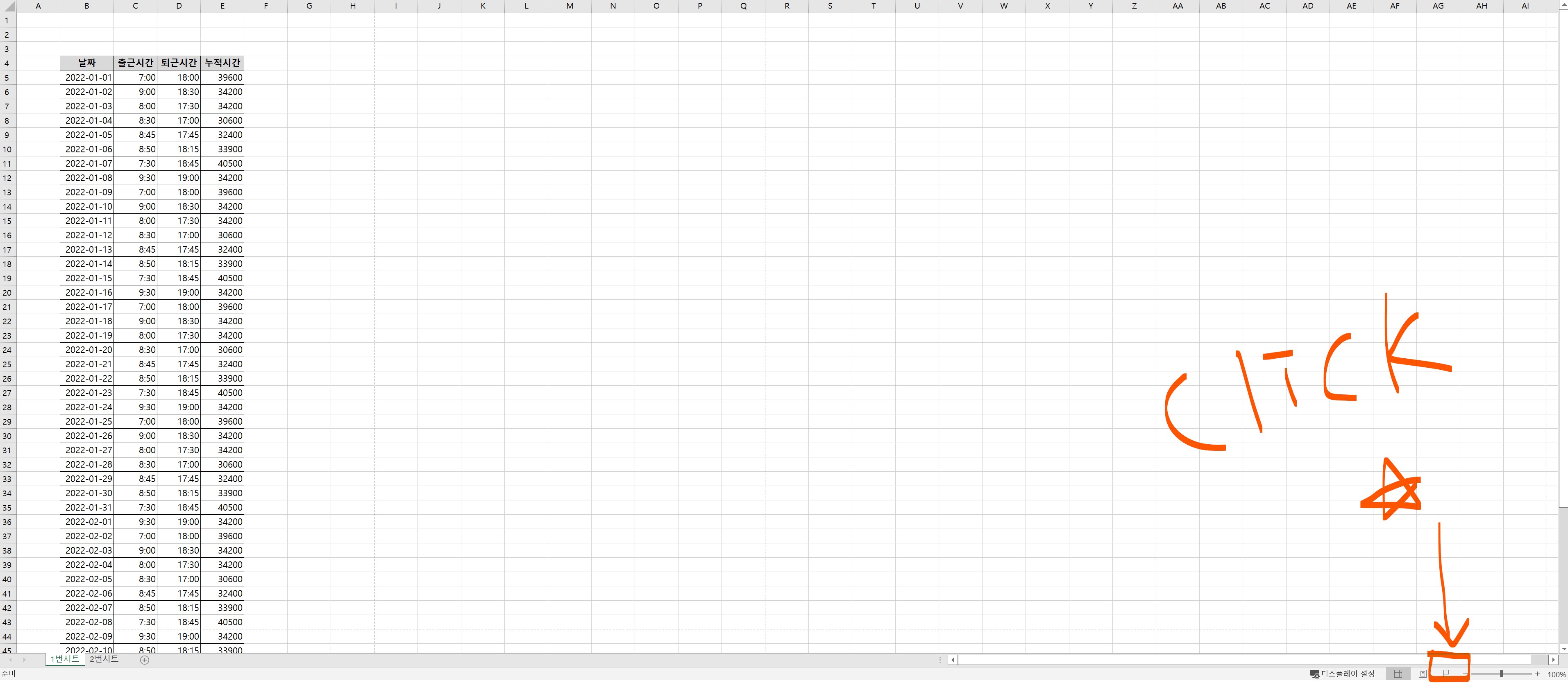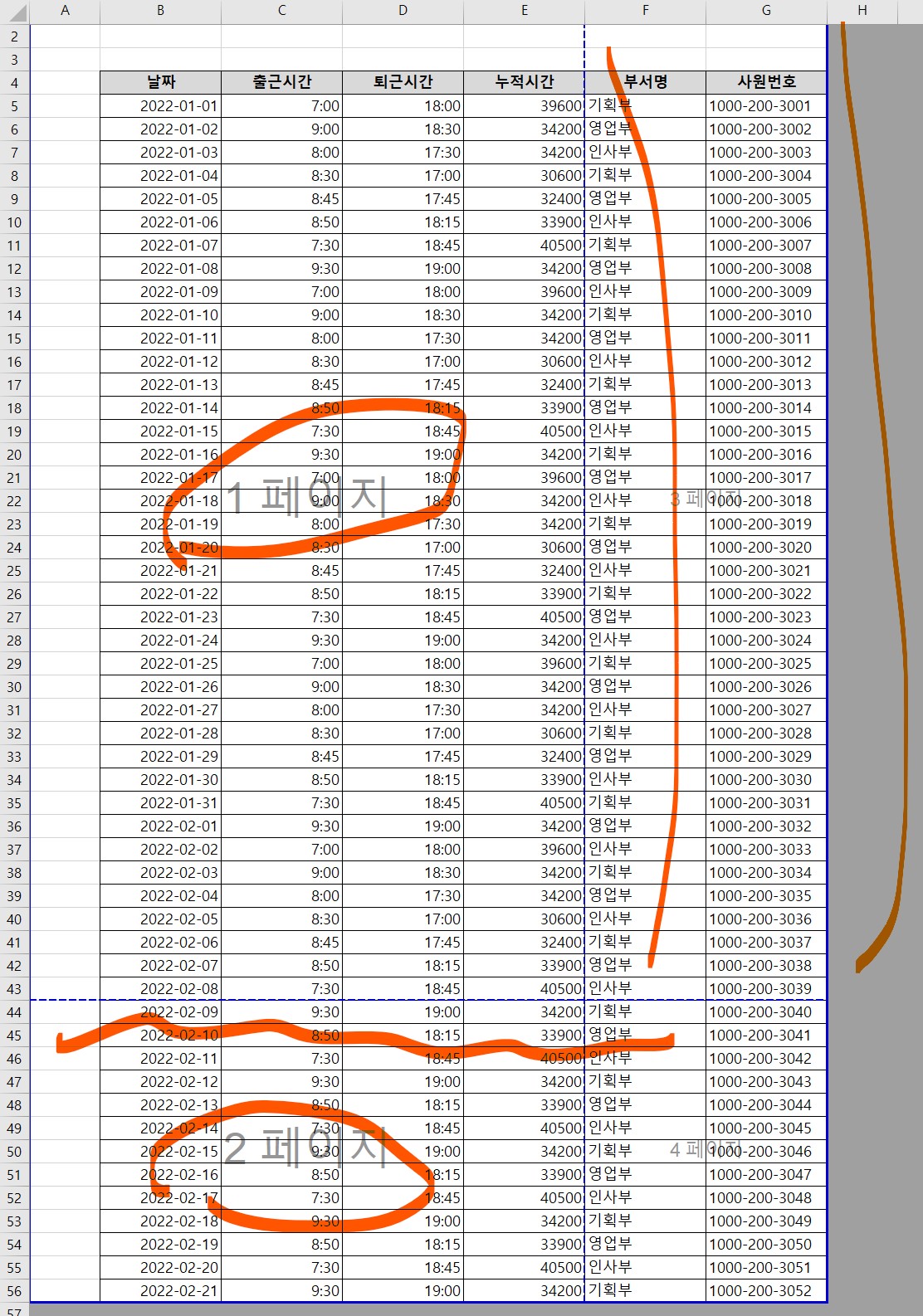 이번에는, 데이터 시트 내에서 바로 페이지를 나누어 인쇄될 구역을 체크해보겠다.