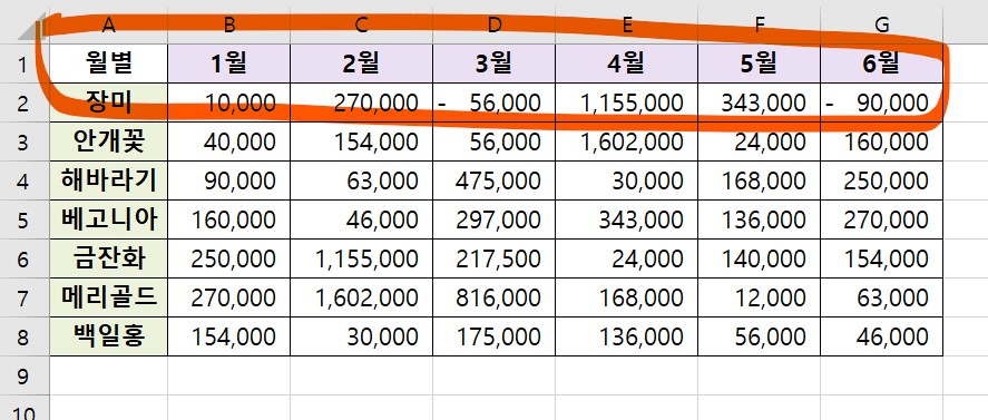 1. 월별 데이터와, 장미 데이터를 블락지정한다.