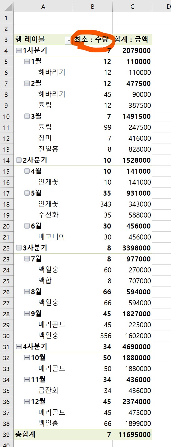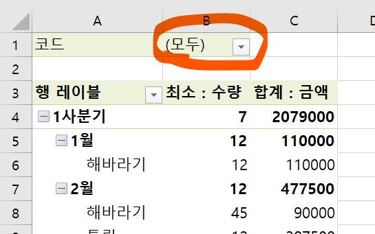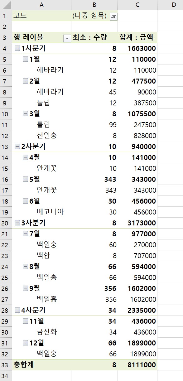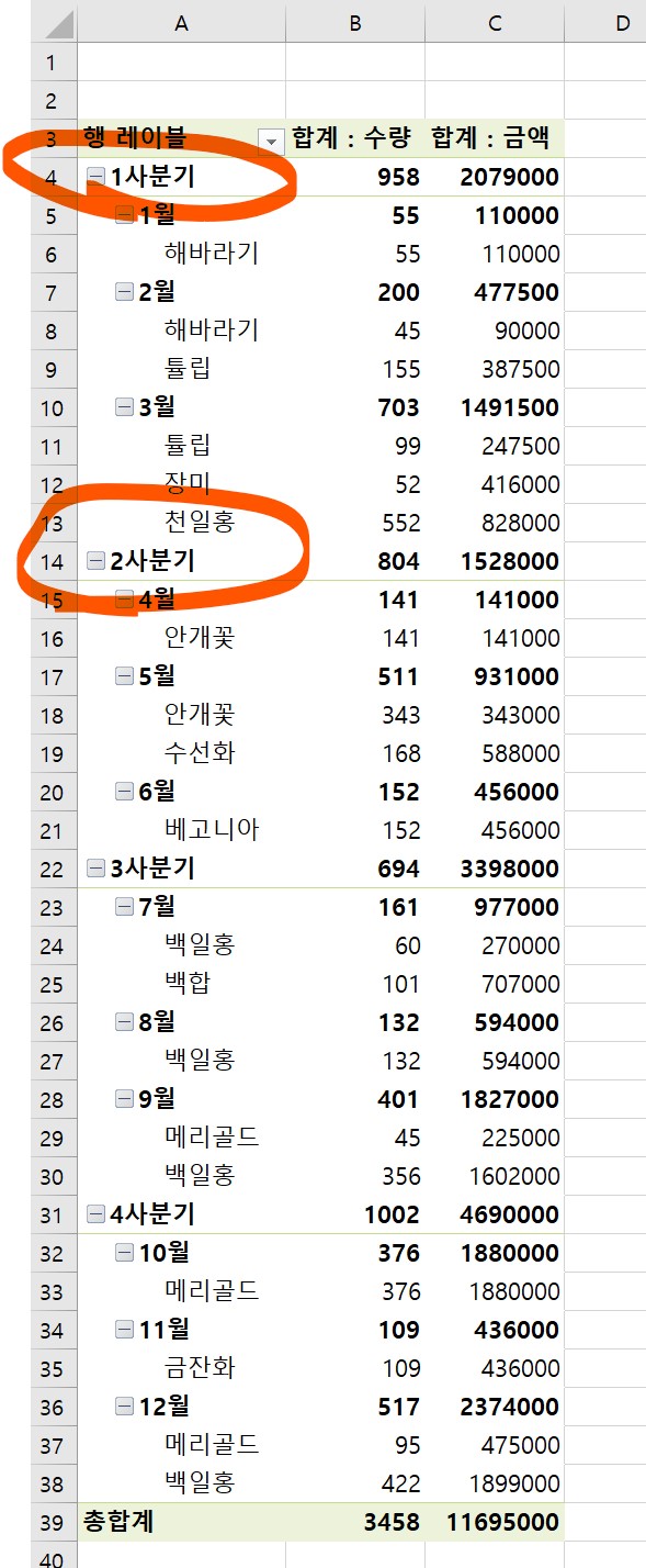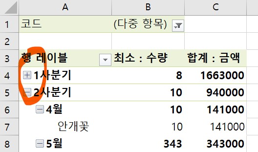 1사분기 앞 -를 클릭해서 +로 변경했더니, 1사분기의 하위내용이 모두 숨겨졌다.