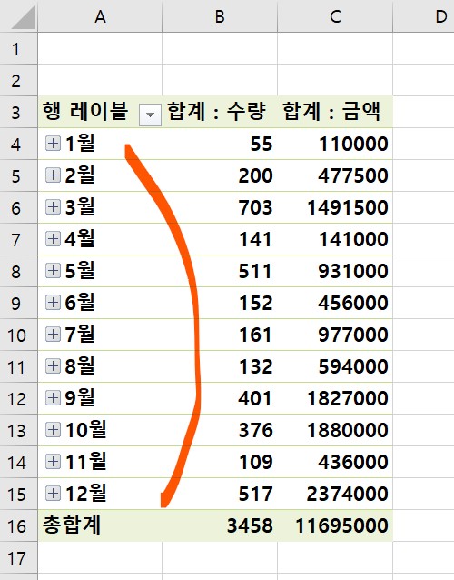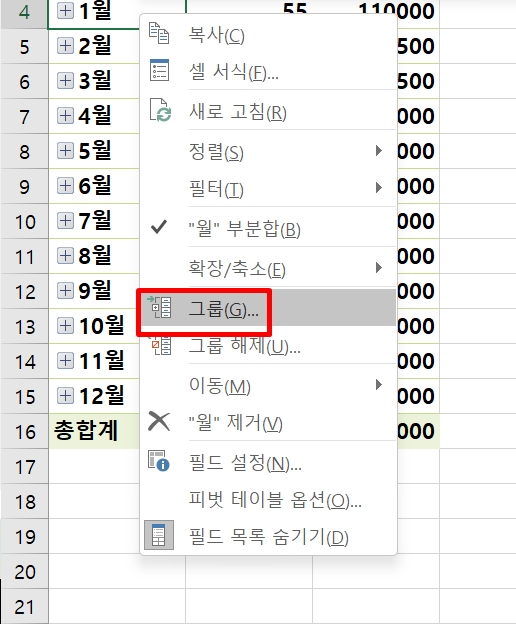 피벗테이블 내에 데이터가 많을 경우 그룹으로 묶어서 정리하면 보기도 좋고 관리하기도 편리하다.