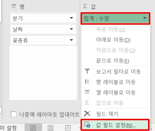 1. [값]안에 있는 [합계:수량]을 클릭한다.