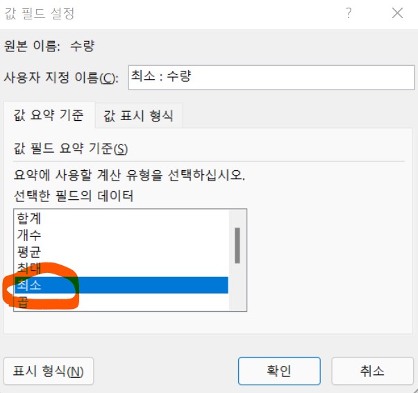 3. [값 필드 설정] 창에서 [선택한 필드의 데이터] 값 중, [최소]를 클릭해준다.