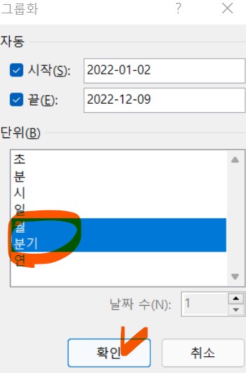 3. [그룹화]창에서 [단위]를 월과 분기로 클릭한다.