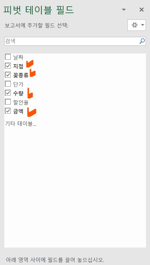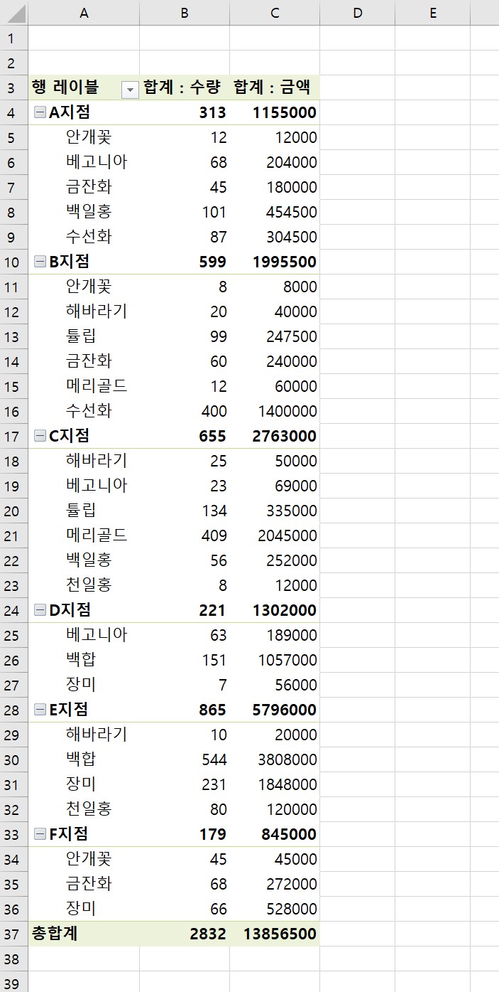 3. 지점, 꽃종류, 수량, 금액만 선택했더니 위와 같은 표가 나왔다.